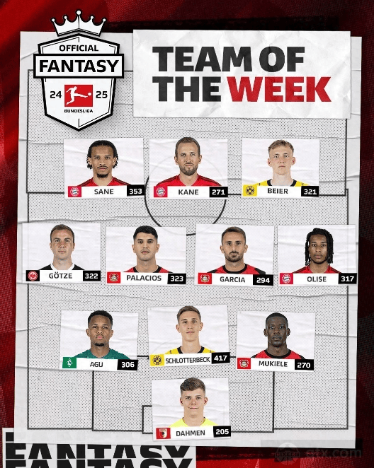 以下为德甲本轮最佳阵容: