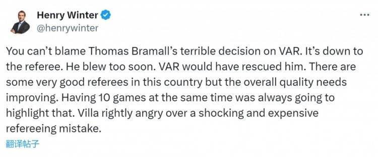 记者Henry Winte在社交媒体上写道:“你不能把托马斯-布拉莫尔(主裁)的糟糕判罚归咎于VAR,这完全是裁判自身的问题。他吹哨太早了,VAR本可以救他。”